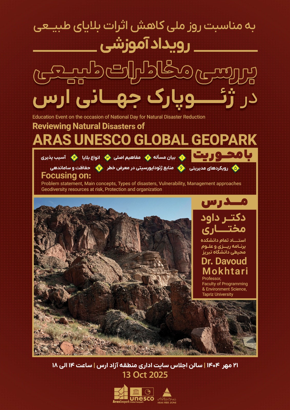 در این رویداد که به مناسبت روز ملی کاهش اثرات بلایای طبیعی برگزار شد، دکتر داود مختاری استاد برجسته دانشگاه تبریز و مدیر مرکز پژوهشی ژئوتوریسم به تشریح انواع بلایای طبیعی احتمالی در ژئوپارک ارس و رویکردهای مدیریتی در کاهش اثرات این بلایا و نیز برنامه حفاظت از منابع ژئودایورسیتی ژئوپارک ارس پرداخت.